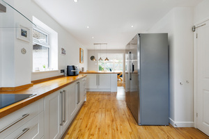 An outstanding detached bungalow that has been thoughtfully extended and refurbished to create a very comfortable and contemporary home. The flexible accommodation includes generous hall space from which the main rooms lead, a sitting room with a woodburner, a refitted kitchen with an island unit, appliances and a distinctive family/dining room with a vaulted ceiling and glazed gable end providing good natural light. The main rooms successfully create open plan living whilst retaining distinct areas in which to eat, relax and entertain. There are three bedrooms, one of which has a fabulous en-suite shower room and a range of built-in wardrobes. The main bathroom has been tastefully refitted and includes a free-standing bath and a separate shower enclosure. In addition, there is a useful utility room. Outside there is a block paved driveway to the front providing off road parking. The rear garden has been landscaped and with ease of maintenance in mind. There is a raised terrace with views across rooftops to distant fields, a circular lawn, well stocked borders, a further covered seating area and side access.